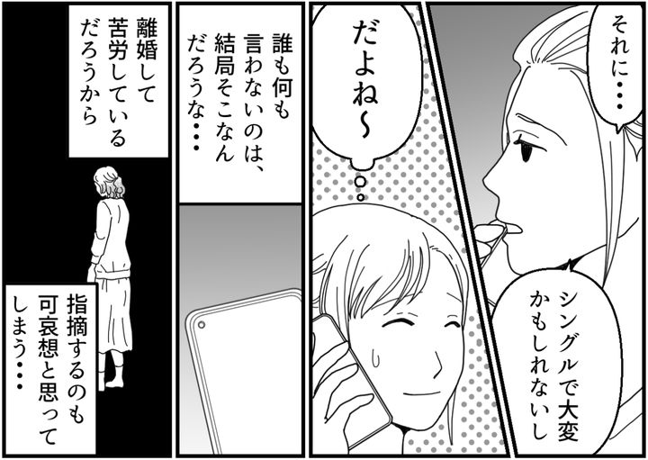 エリやネネは何も言わずに受け入れています。マユコに対して「可哀想だから」という気持ちがあるのでしょう。夫婦円満な自分たちと違って、離婚して苦労しているだろうから……。私は電話を切ってから旦那にグチをこぼしました。