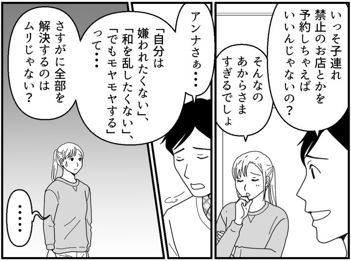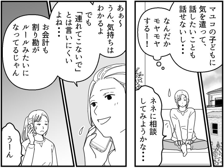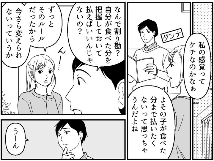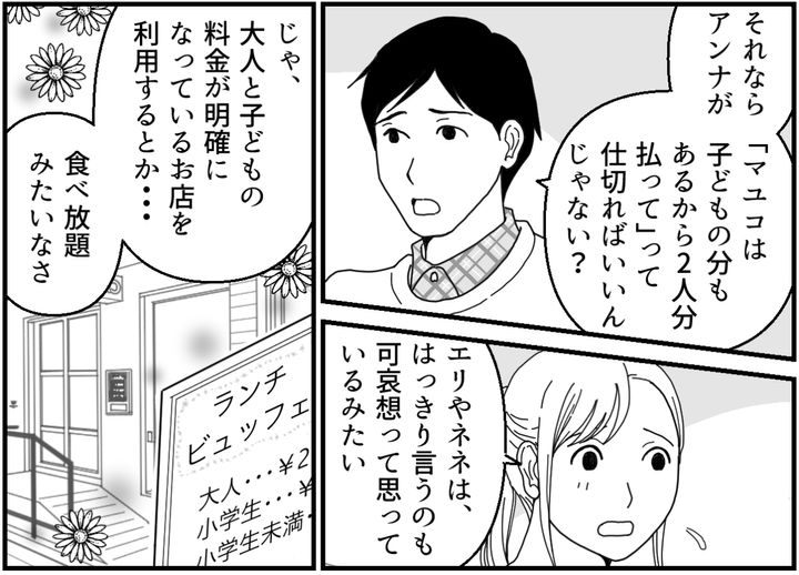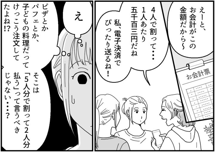 しかもマユコは前と同じように、お会計を4人で割り勘にするのです。子どもが食べた分のお金はなかったことにしたいのでしょうか。そんな態度にもやたらモヤモヤさせられてしまいます。