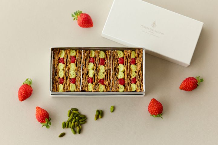 「セザン」のダニエル・カルバート総料理長のシグネチャーとして人気のミルフィーユは、期間限定で「苺とピスタチオのミルフィーユ」が登場しています。繊細な層が重なるサクサクのパイ生地に、濃厚なピスタチオクリームと苺のコンポートを挟み、メレンゲとピスタチオパウダー、ラスベリークリスピーをトッピング。クラシックなスタイルで旬の苺の爽やかさを楽しめます。