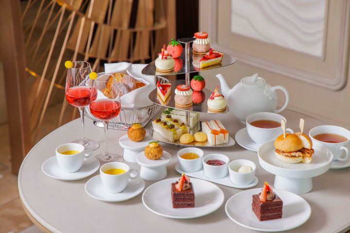 同ホテル内のミシュラン3つ星レストラン「セザン」の総料理長 ダニエル・カルバートが監修する本格的なフレンチの要素を取り入れたセイボリーも見逃せません。今回のアフタヌーンティーでは、濃厚な「パンプキンスープ」や旨味を凝縮した「マルノウチ プルドポークバーガー」、贅沢な味わいの「クラブケーキ 海老のソース」などのバリエーションに注目です。本場イギリスのアフタヌーンティーに欠かせないサンドイッチ3種のほか、バターの芳醇な香り漂うプレーンとストロベリーの2種類のスコーンも揃います。