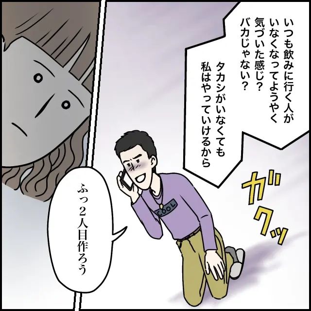 すると、「アツヤも結婚して家族を優先するから俺も・・」と言い出すタカシに、「いつも飲みに行く人がいなくなってようやく気づいた感じ?バカじゃない?タカシがいなくても私はやっていけるから」私の言葉に、「ふっ、2人目を作ろう」と言うタカシは、