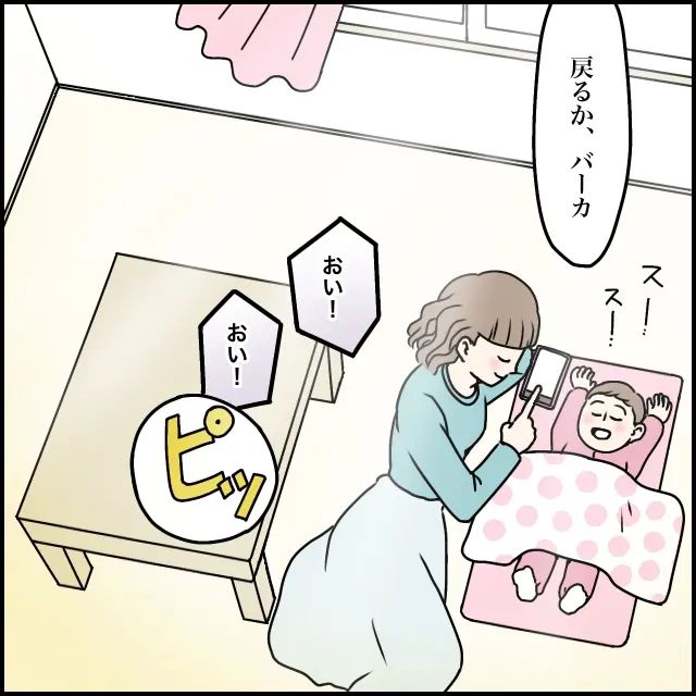 「戻るか、バーカ」と言い捨て、「おい!おい!」タカシが引き留めようとするのも無視して電話を切ったのでした。その横でモモはすやすやと眠っていました。