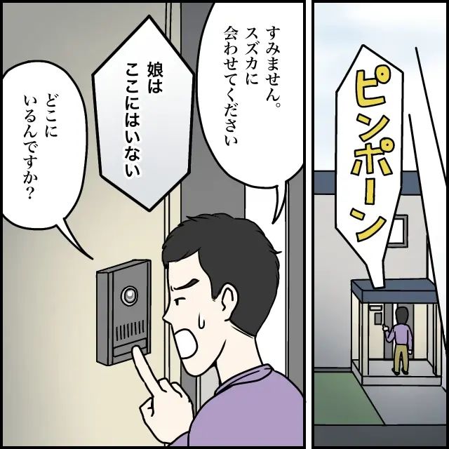 「すみません。スズカに会わせてください」と言うタカシの言葉に、「娘はここにはいない」と素っ気なく答える両親の声。「どこにいるんですか?」とタカシは引き下がらずに話を続けました。
