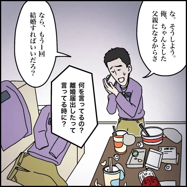 「な。そうしよう。俺、ちゃんとした父親になるからさ」と懇願するかのように言い、「何を言ってるの?離婚届出したって言ってる時に?」と私は訳がわかりません。「なら、もう1回結婚すればいいだろ?」と簡単に考えているタカシが、