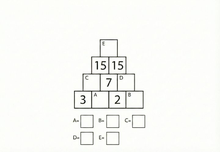 以下のルールに従って、ピラミッド内の空欄 A〜E に入る数字を答えてください。