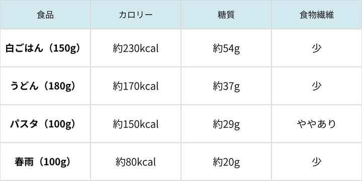 「春雨は、でんぷんを主原料とした食品であるため、栄養価のほとんどは糖質(炭水化物)になります。乾燥状態では軽く見えても、調理後の量に応じて糖質量は増えるため、主食に近い位置づけと考えるのが適切です。