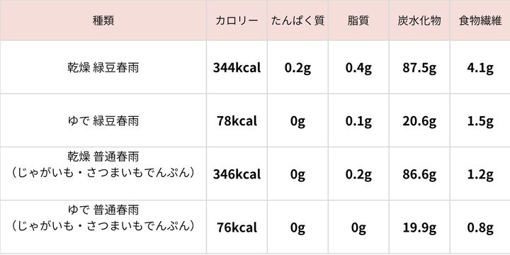 「主成分は糖質で、ビタミンや食物繊維は少なめ。春雨は、ごはんや麺類と比べるとカロリーは低めですが、栄養価も高いわけではありません」