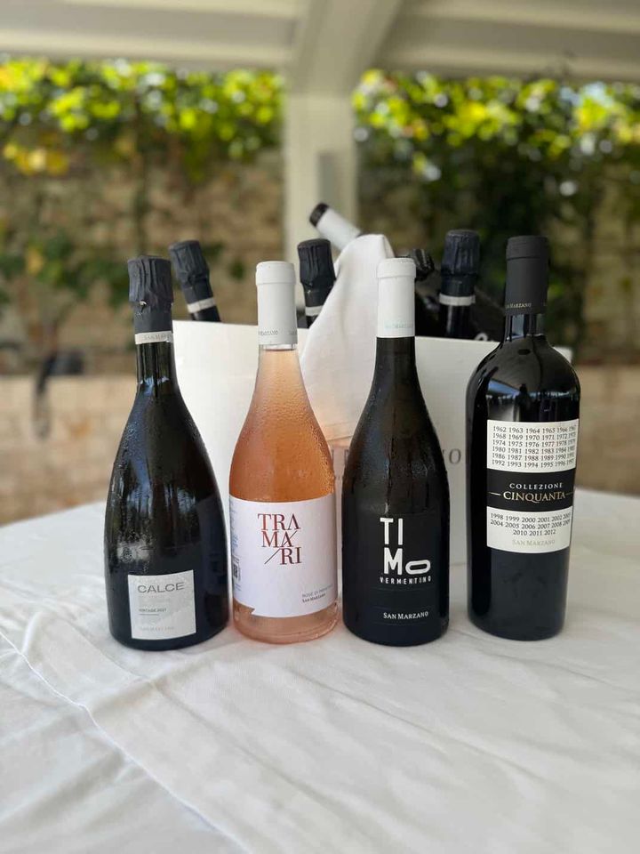 ここで、サン・マルツァーノを象徴するワインをご紹介。右から象徴的な存在となっている創立50周年にリリースした特別な赤ワイン「チンクアンタ」。古木のプリミティーヴォとネグロアマーロを使用し、豊かな果実味とスパイス感、そしてなめらかな余韻を備えています。柑橘系アロマや心地よいミネラル感のある新作「ティモ ヴェルメンティーノ」。ロゼワインの「トラマーリ」は、地中海の光を思わせる淡い色合いと、フレッシュでいきいきとした味わいが特徴。食事の始まりからリラックスした時間まで、幅広いシーンで楽しめる一本。乾杯に相応しいスパークリングワイン「カルチェ スプマンテ メトド クラシコ ブリュット」(日本未発売)。とにかくお手頃なのでフルラインナップ味わって欲しいところ。