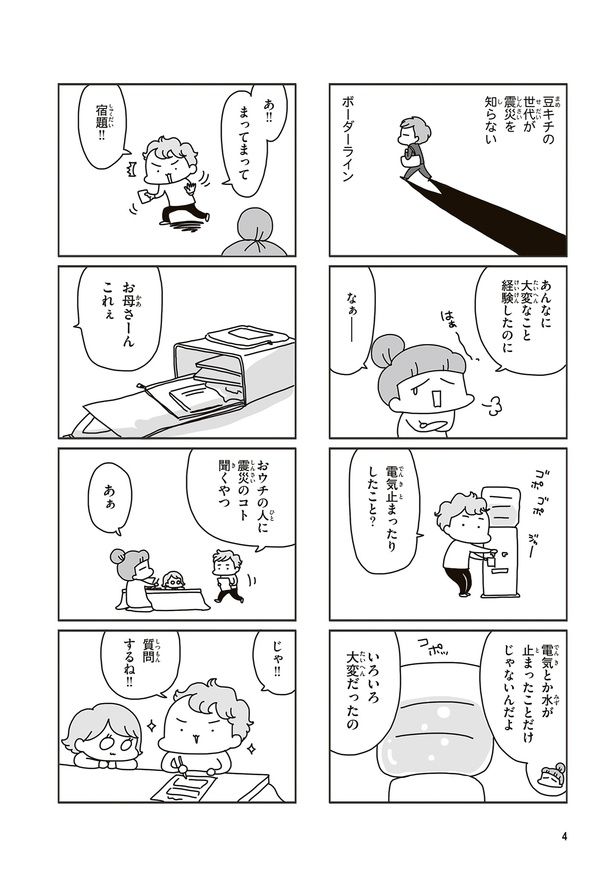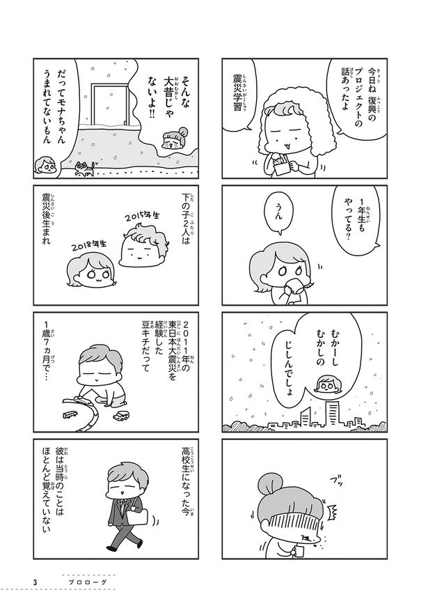 東日本大震災で、突然日常を奪われた1歳の息子と20代の夫婦。子の夜泣きやアレルギーなどから避難所生活をあきらめ、自宅避難で乗り越えることに――。この地震大国で、実は意外と多いかもしれない自宅避難者。その日々を知ってもらうことで、防災の備えの大切さを一人でも多くの人に知ってもらえたら…。世界がひっくり返るような地震が起きても、人間はお腹も減るしトイレにも行きたくなるし、赤ちゃんは夜泣きする。混乱しながらも続けた自宅避難生活。3月11日から4月1日までの中間被災者のリアルを綴った実録コミックエッセイ『今日、地震がおきたら』をお届けします。