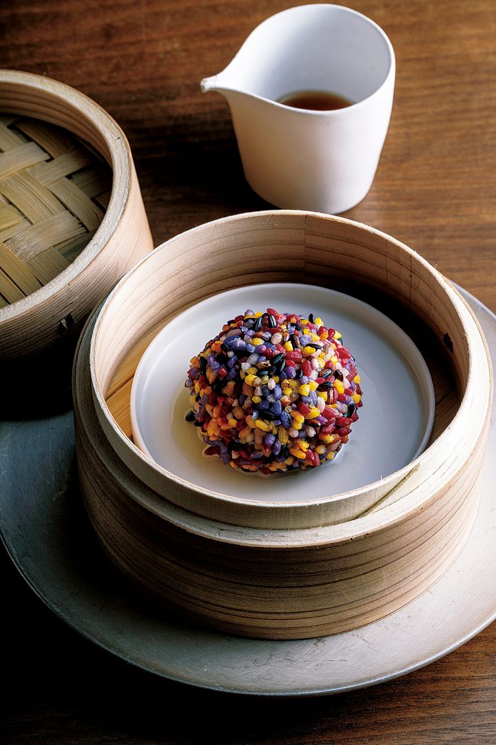 「色を作るのが好きなんです」と、ビーツやターメリックの色素をもち米に吸わせて作る鮮やかな「Syumai」。見た目は中華、中身はイベリコ豚と鶏のミンチに、フォアグラとトリュフを合わせたれっきとしたフレンチ。シュウマイやカレーなど日常の食にヒントを得て分解・再構築することが多いそう。