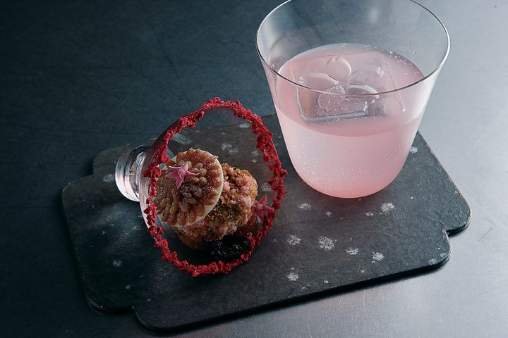 京都・円山公園の桜をイメージした4杯目。「月の桂」のにごり酒を遠心分離機で透明にし、桜のシロップで色付け。アマレーナチェリーと栗のミニパフェと好相性。