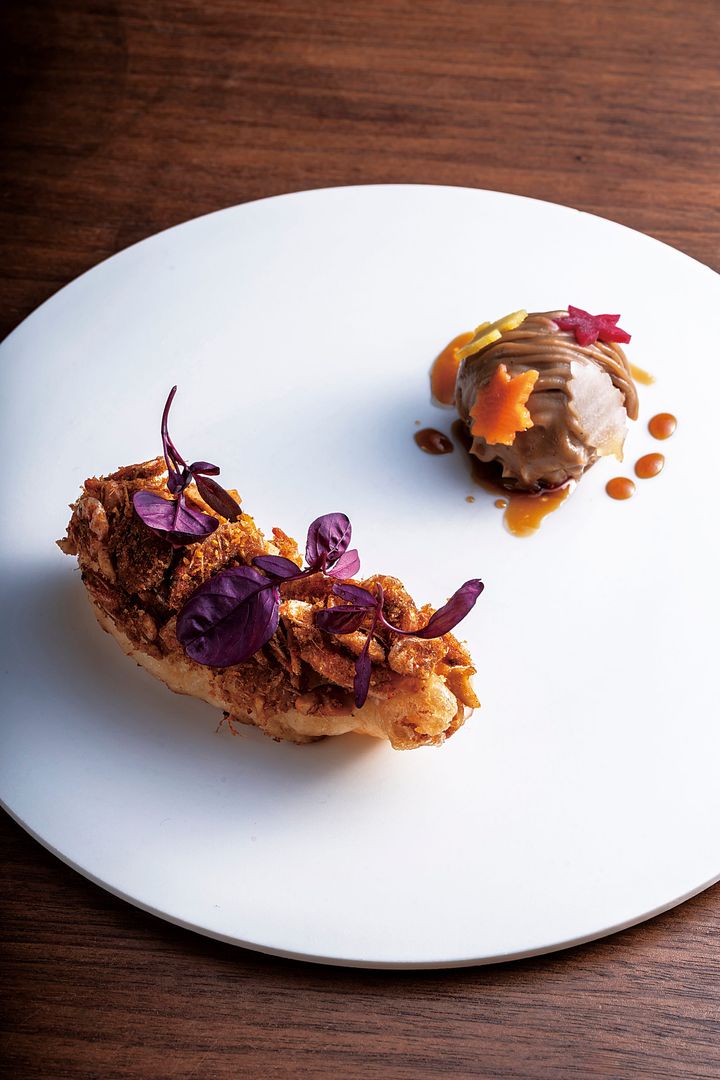 中華料理にインスパイアされたオマールエビのフリットは、スパイスをきかせたみたらし風味のモンブランと。