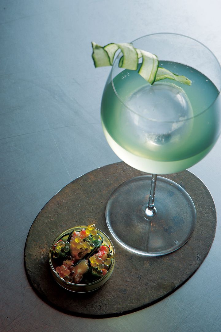 (写真)「ラボラトリーコース」¥18,000より。1杯目は嵐山をテーマに、竹やバジルの香りが爽やかなジンベース。カニとズッキーニのセビーチェを合わせて。