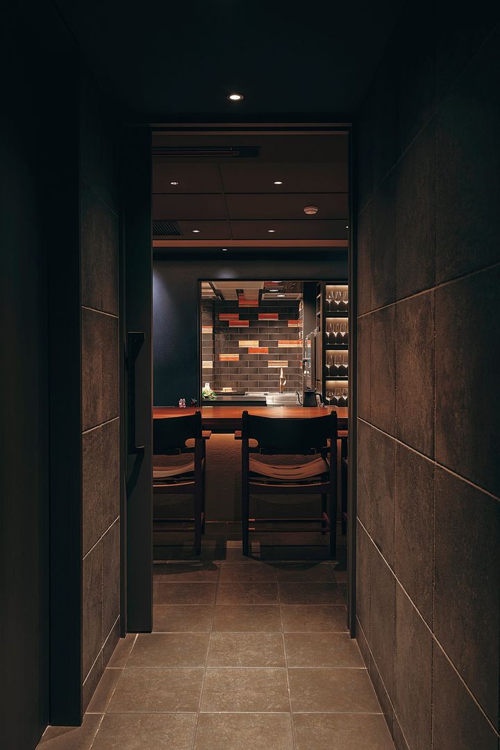 まさに隠れ家。照明を落とした硬質なエントランスから着席までのアプローチが非日常を盛り上げて。