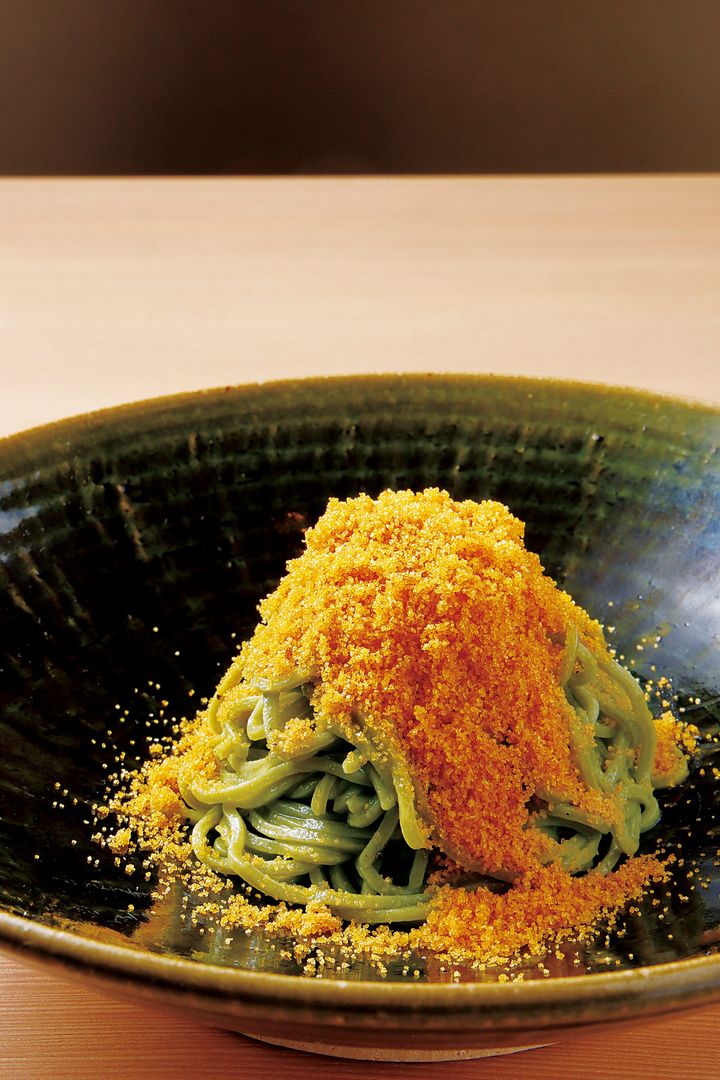 「冷製パスタを茶そばで作るイメージです」と言うカラスミをあえた茶そば。絶妙な塩加減に「締めのつもりが余計にお酒が進む!」というファンも多いそう。 ¥2,300