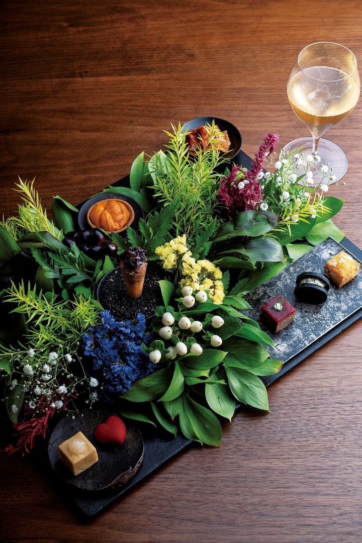(写真)おまかせコース¥28,600[サ別]より。思わず歓声が上がるフォトジェニックなひと皿は「ラ カンロ」のシグネチャー。趣向を凝らした9種類のフィンガーフードが、ブーケのような草花の中に。