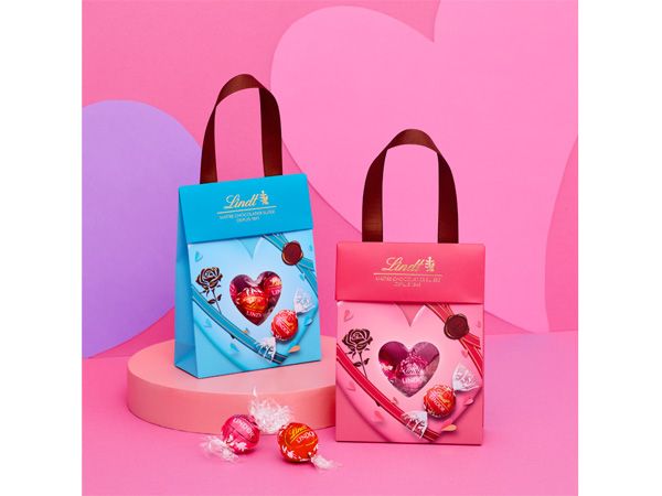 そのまま手渡しができる、ハンドル付きのカジュアルなギフトバッグ。中身は、バレンタイン限定の「ハート」や「バレンタイン」をはじめ、不動の人気を誇る「ミルク」「抹茶」「ストロベリー」といったリンドールがアソートされています。
