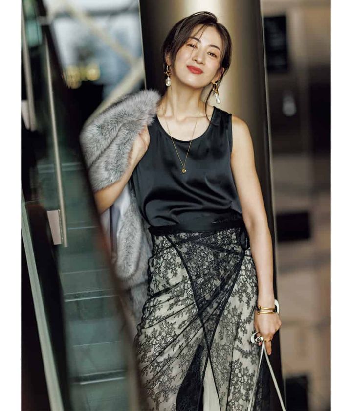 4位 クリスマスイブは【黒レーススカート】の重ねワザでパンツStyleも一気に艶めく
