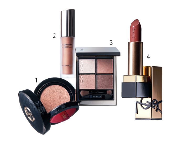 1.光を反射するパールピグメントが、くすみや色ムラを補整。ケア効果が高く、シルクのような繊細なツヤを宿した肌に。ルミナス シルク プリマ グロー ¥12,540() 2.スキンケア成分を高配合。溶け込むようになじむブロンズカラーで、ツヤと血色を同時にオン。スキンフィニッシュ ライトストラック リキッド ハイライター ブロンズ グレイズ¥5,500() 3.これぞ、大人のヌードメイクの新定番。重ねてもよれず、シームレスな仕上がりに。シグニチャー カラー アイズ 15 ¥7,700() 4.【KEY ITEM】サテンテクスチャーで濃密な発色。80%ケア成分配合で、長時間唇の潤いを保持。深みのあるガーネットカラーが口元を引き締め、こなれた印象に導く。ルージュ ピュールクチュール N16 ¥6,710()
