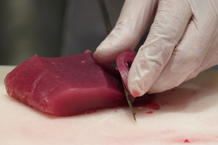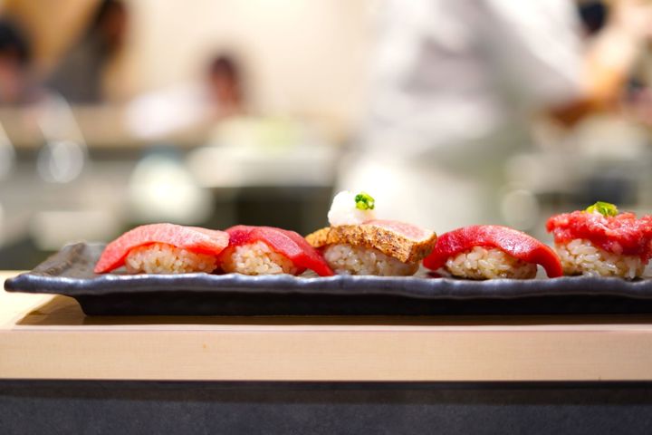 解体ショーで捌かれたおろしたての身は、職人によって手早く握られていきます。包丁さばきからはまぐろの弾力と柔らかさが伝わり、生本まぐろへの期待が高まります……!
