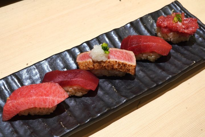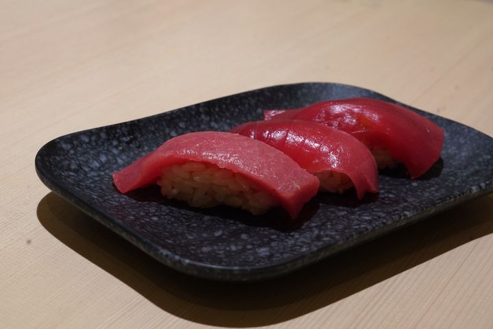 その場で提供されたのは鮮度抜群の赤身と中とろ、大とろの3貫。濃厚なまぐろの旨みはまさに贅沢の一言で、温度管理にこだわった赤シャリとよく合い、上質な脂が口の中で溶け合います。