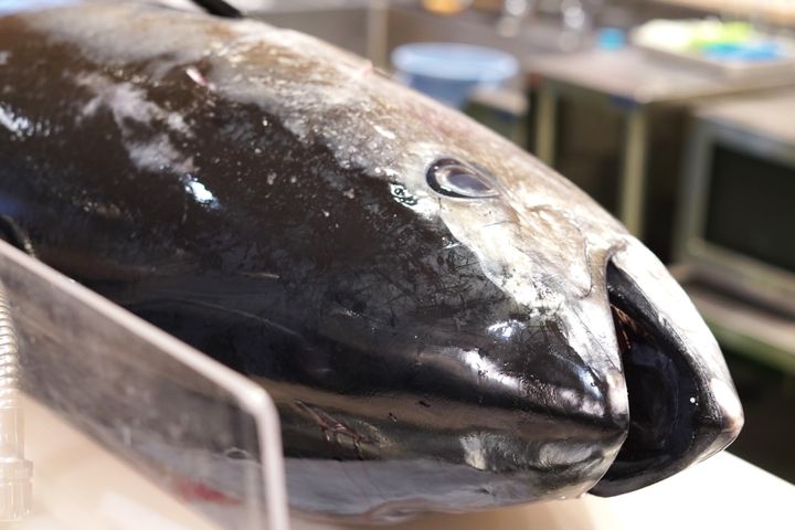 早速お店に入り、本日のショーで解体されるマグロとご対面。約58㎏の立派な本マグロがカウンターのすぐ内側にドンと並んでおり、さすがの迫力です。