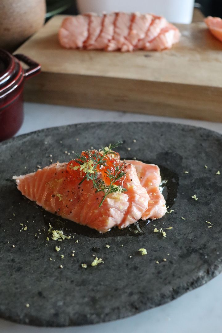 白ワインビネガーを主役に、ディルと柑橘の香りを重ねたサーモンのマリネは、ワインとのペアリングにぴったりの一皿。低温でやさしく仕上げることで、身が締まりすぎず、しっとりとした口当たりに。爽やかな酸味がサーモンの脂を軽やかに引き立て、ディルの清涼感と柑橘の香りが華やかに演出してくれる。