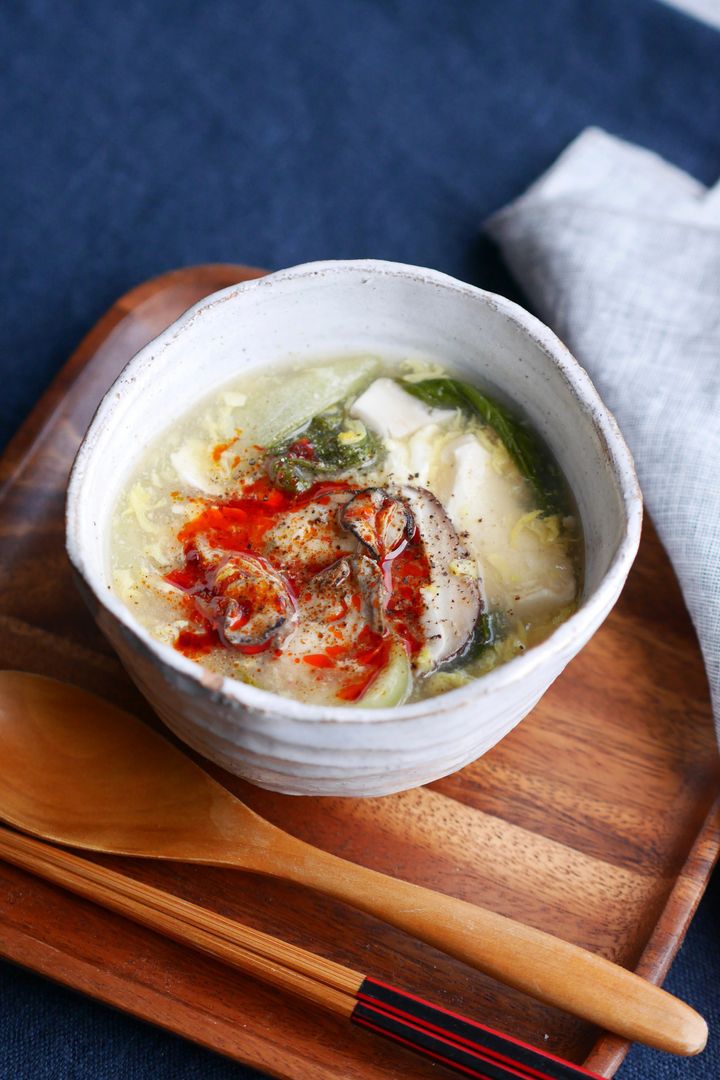 寒い季節に恋しくなる、ホット&サワーなサンラータン。旬の牡蠣を加えることで、いつもの一杯がぐっと奥行きのある味わいに変わる。味付けを少し濃いめにすれば、ご飯を入れてスープご飯にしたり、麺を加えてサンラータン麺として楽しんだりとアレンジも自在!