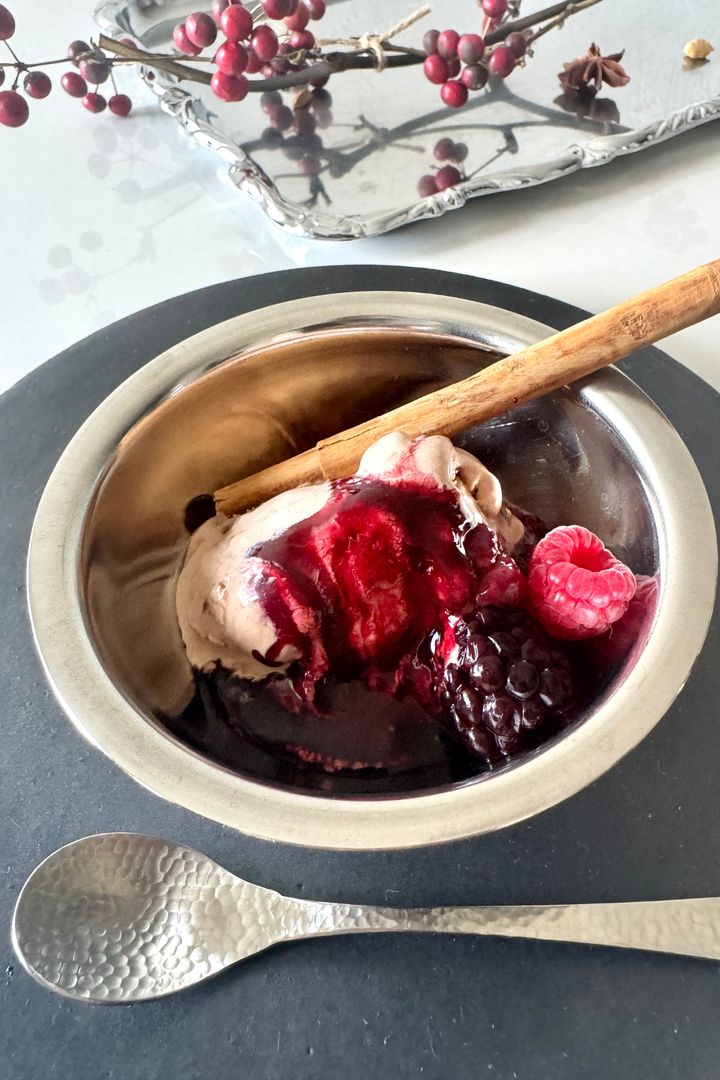 市販のアイスクリームがデセールに昇格! ベリーの酸味とスパイスの余韻で、甘さに奥行きが生まれる。赤ワインビネガーにスパイスと冷凍ベリーを合わせたフルーツビネガーは、ドリンクに加えたり、ソースの隠し味に使ったりと幅広く活躍する。