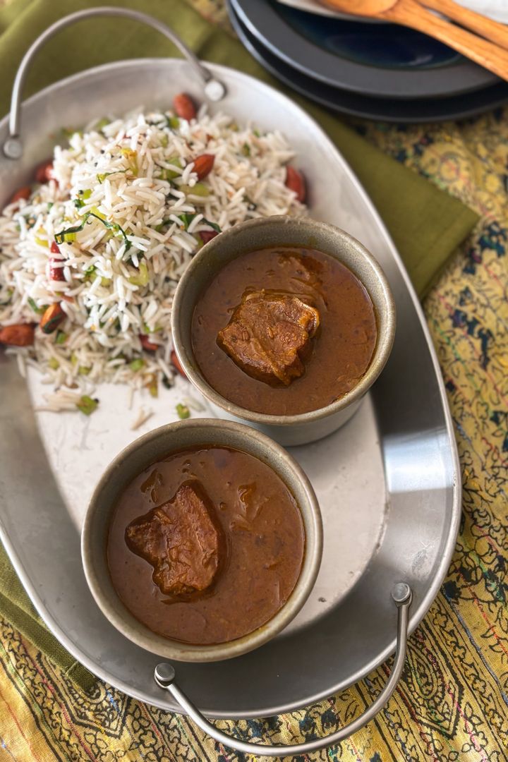 赤ワインや酢を効かせた、インド・ゴア地方の酸っぱ辛いカレー。辛さの奥にしっかりとコクがあり、ひと口ごとに食欲を刺激する、パンチのあるおいしさ。ごはんと合わせるのはもちろん、パンやナン、バゲットと一緒に味わって。