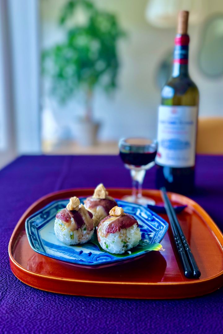 干しぶどうとクレソンを混ぜ込んだ酢飯にフォアグラを忍ばせ、鴨の燻製で包んだリッチな手まり寿司。バルサミコ酢ベースのソースをかければ、甘みとコク、香ばしさが重なり合う。見た目も華やかで、パーティーの前菜にも存在感を放つ。