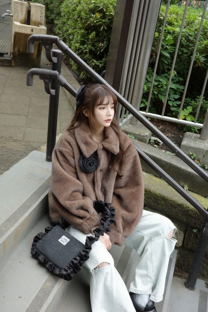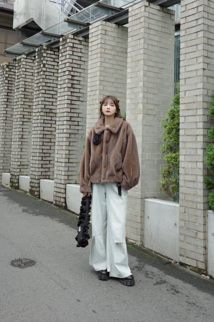 「トレンドアイテムのファーアウターを使った、冬スタイル。ダメージデニムとガーリーな小物をあわせて今年っぽい雰囲気に。フリルバッグやコサージュ、シューズで黒を投入しているので、ほどよくコーデを引き締めてくれます」(idem / ANUブランドディレクター 村田倫子さん)