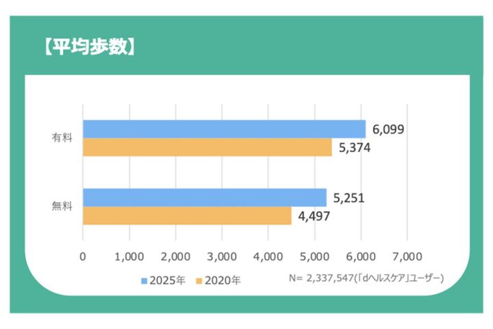 健康管理アプリ「dヘルスケア」では、有料・無料を問わず歩数が増加しています。2025年のデータでは、有料版ユーザーが平均6,099歩、無料版ユーザーが5,251歩となりました。