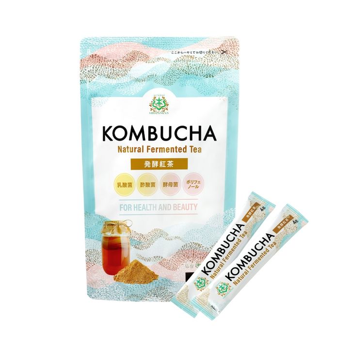 紅茶と発酵のちからで、腸内環境を整える発酵紅茶飲料「コンブチャ」。香料・着色料・保存料・酸化防腐剤、余計な甘味料は一切不使用。さらに生きたプロバイオティクス(乳酸菌など)を100gあたり3億個配合し、からだの内側からすっきりサポート。粉末タイプで持ち運びやすく、水やお湯にスティック1本混ぜるだけ。手間がかからず飲み続けられることで、毎日の元気と美容を補う。