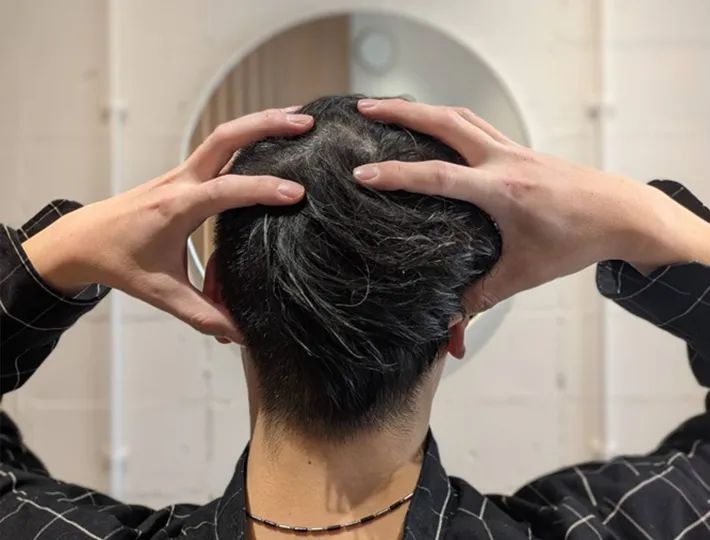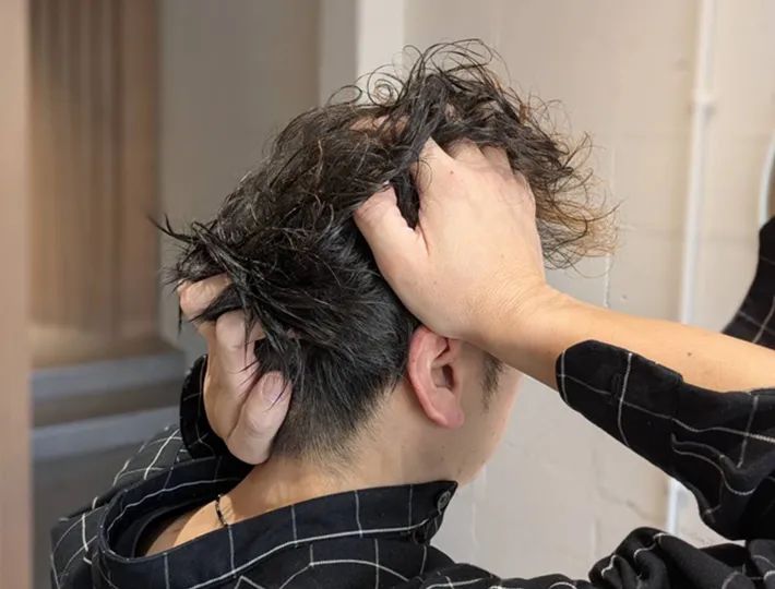 襟足から頭頂部に向かって、指をずらしながら押し上げていきます。
