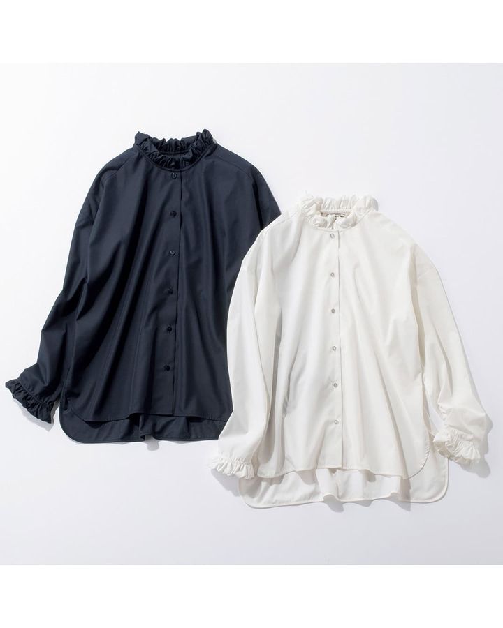 シワになりにくい、ハリのある素材を使用。さりげないフリルがシャープなシャツに可愛らしさを加えます。サイドスリットと前後差のある裾なのでインしなくてもバランスがとりやすい。