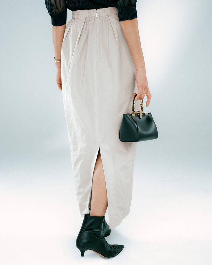 ウエストにギャザータックを入れた旬のコクーンシルエット。タフタ素材は動くたびに揺れる軽やかさとハリ感があり、どことなくモードな印象を引き立てます。ウエストは後ろゴムで楽ちん、バックスリットで足捌きもよくストレスフリーな1着です。