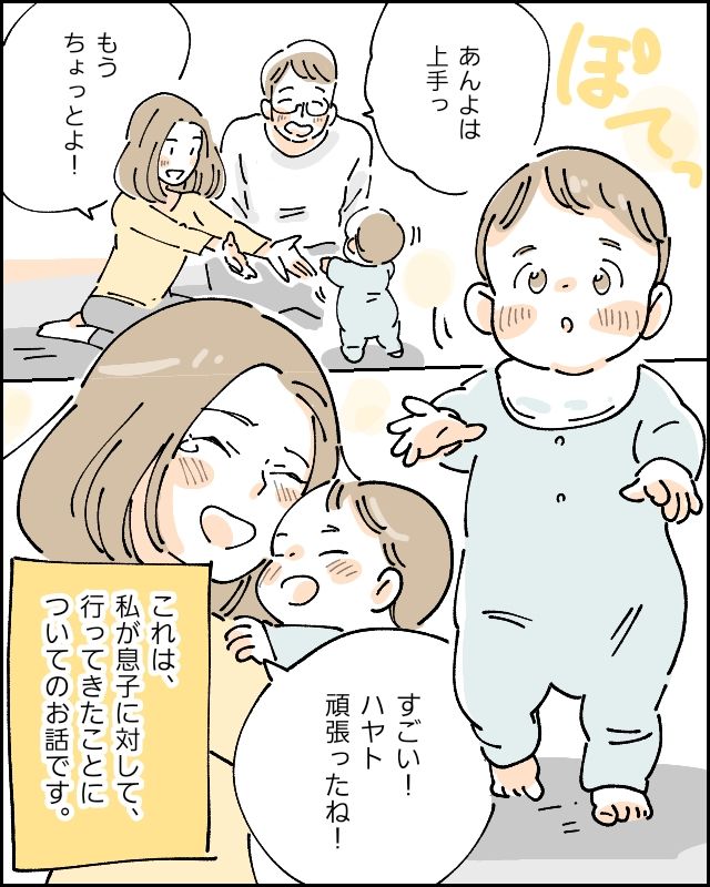 ハヤトは1歳の誕生日よりもずいぶん前にあんよができました。その頃は一生懸命に歩く練習をするハヤトを夫と2人で応援しながら、たくさん褒めて、ハヤトの成長を見守り、心から喜んでいました。