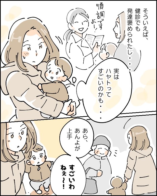 でもよく考えてみたら、健診でも順調な成長だと褒めてもらえたし、近所の人やすれ違う人たちにもあんよが上手、すごいと褒められていくうちに、ハヤトは成長が早いのだな、運動神経が良いのかなと思うようになりました。だって、こんなにもたくさんの人たちがわざわざ声をかけて、称賛してくれるんだもの。
