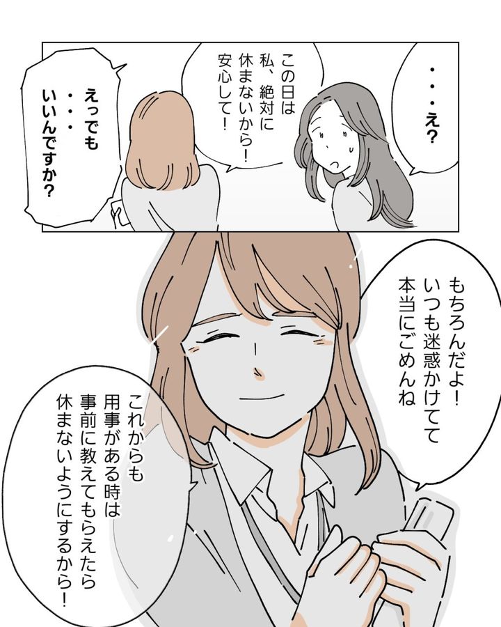 「大丈夫!この日は私絶対に休まないから!安心して!」予想外の言葉に、私は目を丸くして「えっ・・・でもいいんですか?」と聞き返しました。すると大宮さんはにこっと微笑んで、「もちろんだよ!いつも迷惑かけてて本当にごめんね、これからも用事がある時は事前に教えてもらえたら休まないようにするから!」そう言ってくれたのです。