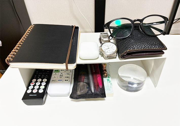 後は、ブックエンドの棚をテーブルに設置。上下のスペースに物を置けば、テーブルの上がスッキリ片づきますよ!