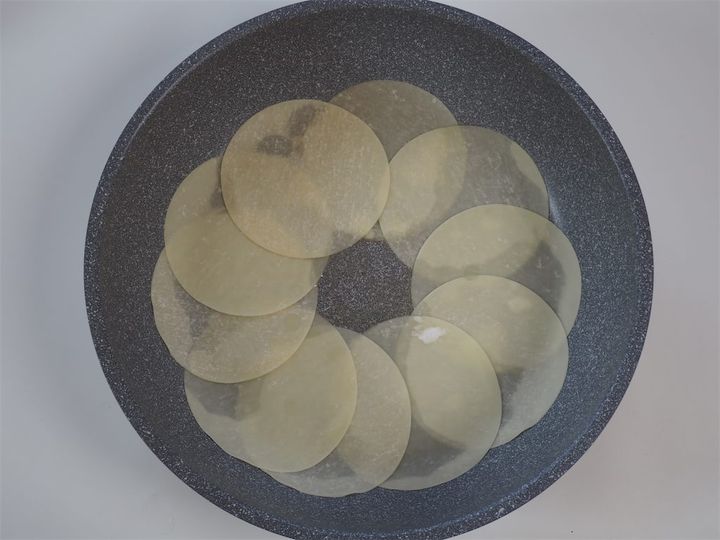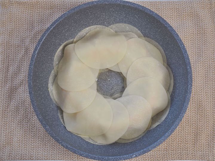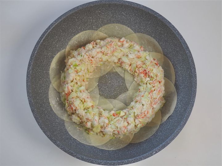 3. 火を点けていないフライパンに油大さじ1を広げ、餃子の皮10枚をドーナツ状に敷き詰める。2を絞り出してのせたら、残りの皮も被せて軽く押さえる。