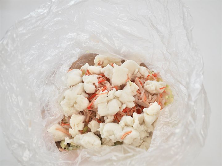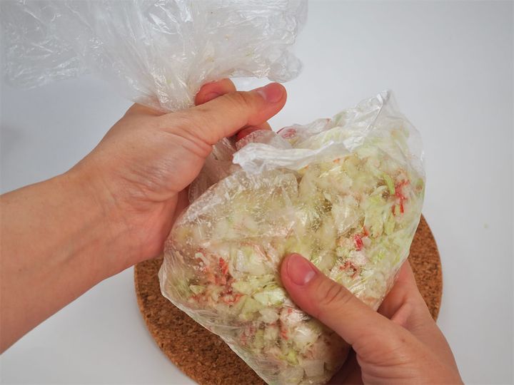 2. ポリ袋に1[A]、ほぐしたカニ風味かまぼこ、袋の中で崩したはんぺんを加えて揉んで混ぜ合わせる。袋の端を2cmほど切っておく。
