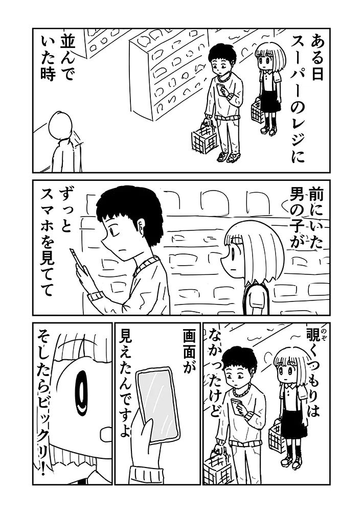 ある日、スーパーマーケットのレジに並んでいると、前に並んでいた男性のスマホ画面がたまたま目に入ってしまい…。