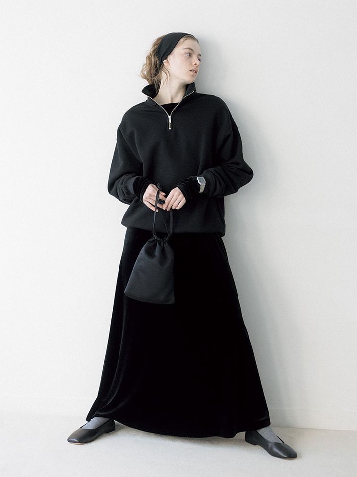 肉厚すぎずちょうどいい10オンスのハーフジップスウェット。ゆったり着られるサイジングでありながら、首元をしっかり覆えるハイネックで大人に必要なきちんと感も忘れない。フロントを開いて抜けをつくれるから、緊張感が出がちなALLブラックのカジュアルダウンにもひと役。