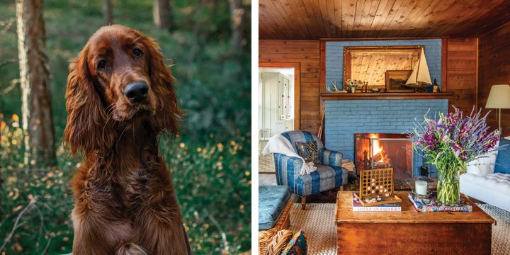ツイード生地やヴィンテージの魚籠(びく)、使い込んだキャンバス地のような渋い色合いのインテリアは、人懐っこいアイリッシュ犬たちがくつろぐ空間に驚くほどしっくり馴染む。ただし、お気に入りのレザーデッキシューズを彼らのおもちゃにされないよう、くれぐれも気をつけて。