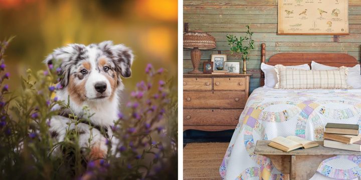牛や羊を追うのが得意で、カウボーイの相棒としても知られるたくましい牧羊犬。そんな彼らには、あえて“モダンすぎない”クラシックなファームハウスがよく似合う。懐かしさを感じるキッチンの雑貨や、アンティークのパイン材家具、そして代々受け継がれてきたパッチワークキルト。そんな温もりに満ちた空間こそ、彼らが一番自分らしくいられる場所だ。