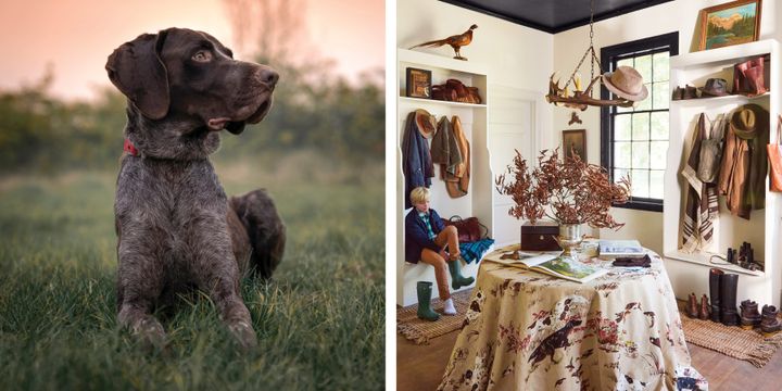 鹿の角のオブジェやアンティークのデキャンタ、そして気品ある伝統柄のファブリック。タフに働く猟犬たちは、洗練されていながらもどこか武骨で、野性味を感じさせる空間が一番落ち着くよう。重厚なレザーのチェスターフィールドソファや温かみのあるパイン材の壁、そしてキジの形をしたおもちゃがあれば、彼らにとってはもう最高だと言える。