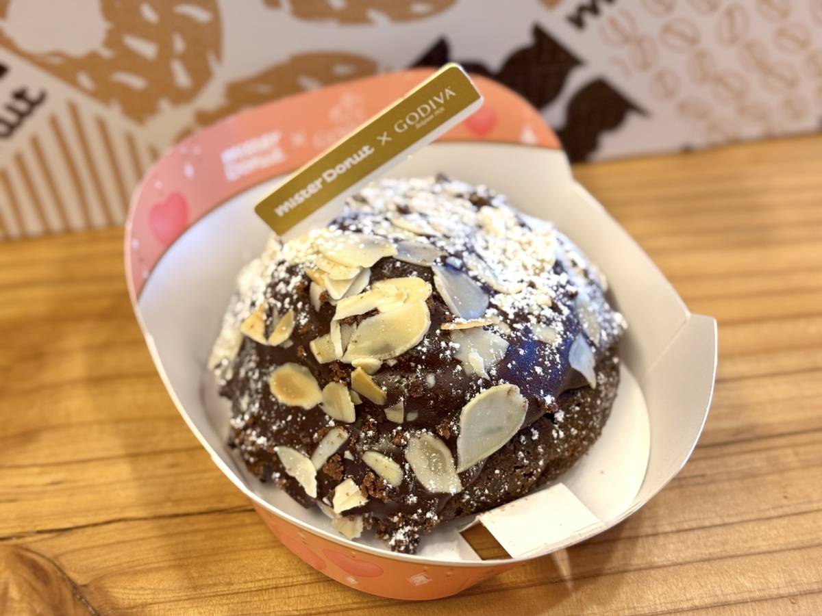 ショコラのなめらかさに、プラリネとナッツの香ばしさを重ねた贅沢なドーナツ。ゴディバコラボならではの完成度で、甘いもの好きにはたまらない仕上がりです。