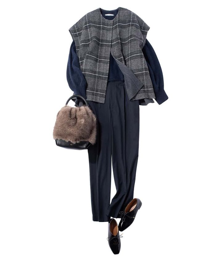 チェックのジレが主役のワントーンコーデ。洗練された印象の小野さんをさらに上品に格上げしてくれるネイビーでまとめました。ふわもこバッグと毛足の長いニットで季節感を演出。素材の違いでリズムと立体感を出すのがポイントです。
